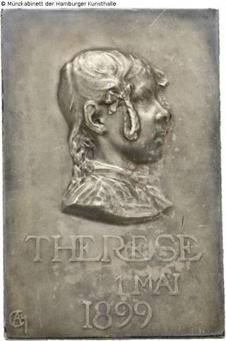 Obverse: Sitting woman to the left on a chair giving her breast to a child; reverse: Bust portrait of a girl to the right with ribbons in her hair, monogram AC. at bottom left, legend: THERESE / 1 MAY / 1899; border: ARGENT 255.