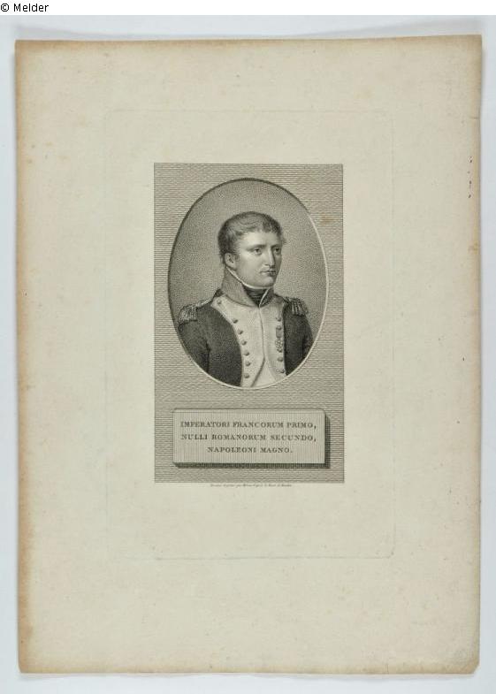 Designation bottom centre: " Dessiné et gravé par Mécou d'après le buste de Houdon". Caption on the plate: "Imperatori Francorum Primo, Nulli Romanorum Secundo, Napoleoni Magno." Without passepartout. On the back of the sheet pencil note "34L" top left corner.