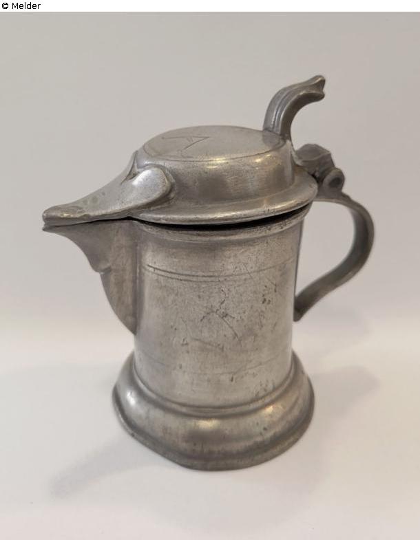 Small pewter jug, lid attached to handle with hinge, spout-like spout, engraving "A" on lid