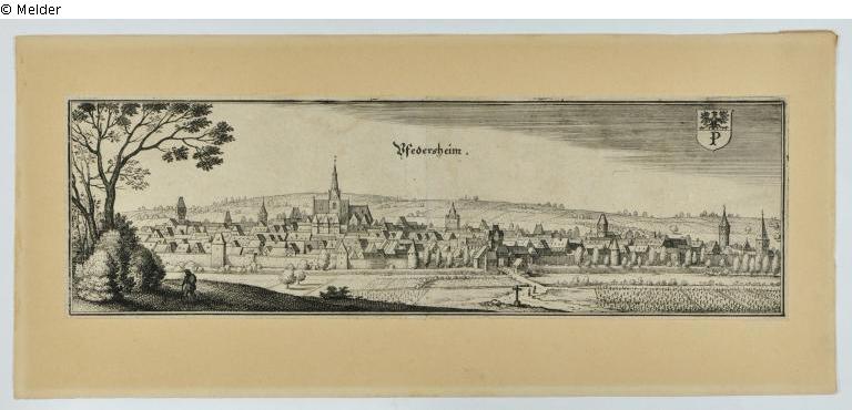 Caption "Pfedersheim", upper right in the plate local coat of arms. Untitled. On the back traces of adhesive tape. Without passepartout.