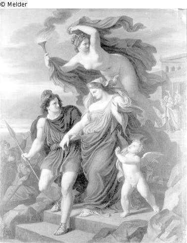 Signatur: C. Rahl 1863; Helena nach halblinks vorn auf Stufen von Paris, der zu ihr aufschaut, geführt. Rechts ein Putto. Über der Gruppe schwebend weiblicher Genius mit Fackel. Rechts im Hintergrund Tempel mit Staffage.