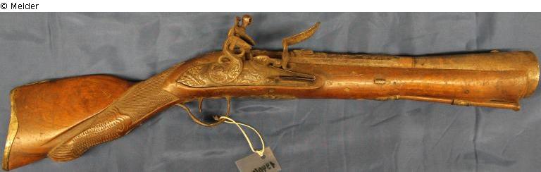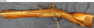 With flintlock. Tapered, funnel-shaped barrel, decorated with warlike emblems. Parts of the lock with rich, partly gilded rococo ornamentation; trigger guard like the lock fitting made of brass; left fitting silver. Walnut stock, the butt carved. Under pistol barrel: coat of arms, stamp, hallmark: Ville Croze S. Mayo; engraved: "À MARSEILLE"