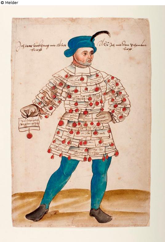 A full-figured Schembart runner with a facial mask and a waist-gowned dress of paper-covered, hand-written indulgence letters. On the sheet in the picture field betextet: "Ich war umbhengt mit Ablaßbrieff Also ich mit dem Schembart lieff". On the individual letters, which are part of the costume, words are handwritten literally as "man find" "Von machen" "folksames" ... " wie sich die Fasnacht drüber giesst, "all gut", "frölich".