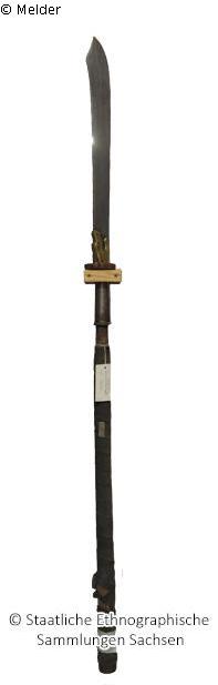 Chinese sabre lance type Chai Dao, blade bordered by a tiger head, on the handle metal plate with stamped number 37.286
