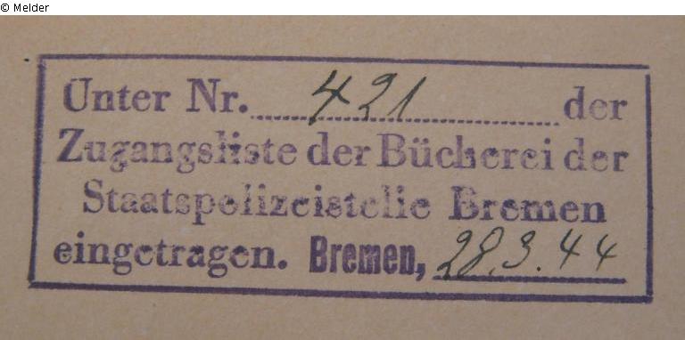 On half-title rectangular stamp inscribed "Registered under No. 421 of the access list of the library of the State Police Bremen, Bremen 03/28/44