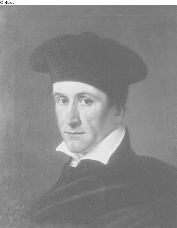 Half-length portrait in front of a green background. Body in profile to the left, head in half profile. Black beret, high-collared black coat with white shirt collar. Narrow, beardless face, high brows, dark, grey-brown eyes looking at the viewer. Long strong nose with narrow curved back and sensitive nostrils.