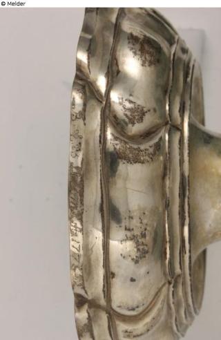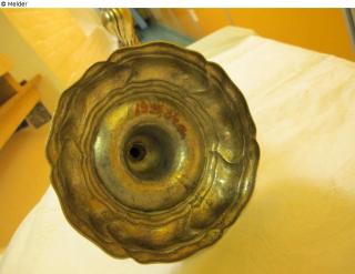 The single-flame silver chandelier stands on a round base with stepped edges. A decoration of winding folds runs over the edges. The bell-shaped intermediate piece placed on the foot supports the shaft, which is shaped like an inverted baluster and has twisted features. The spout resting on top is spherical in its lower part and then slightly retracted over a profiled rod. At the upper edge it swings out again slightly in a bulbous edge. Dotted inscription in italics on the foot edge/edge: "E.B. d. 25. December A. 1776",