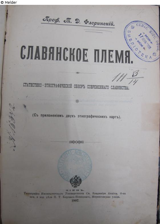 Plünderung der Bibliothek: RS 15/3 Bataillon der Waffen-SS z. b. V.: Meldungen vom Einsatz in der Ukraine und Krim. o. O. 1942, 14f.; Politisches Archiv des Auswärtigen Amtes, R 27557, Meldung Nr. 75 aus Kiew, 13. 07. 1942; Exlibris in den Alben aus dem Offenbach Archival Depot verzeichnet: National Archives Washington, RG 260, Series: Photographs of Library Markings from Looted Books, Made by the Offenbach Archival Depot, Album II, S, Nr. 347 a.