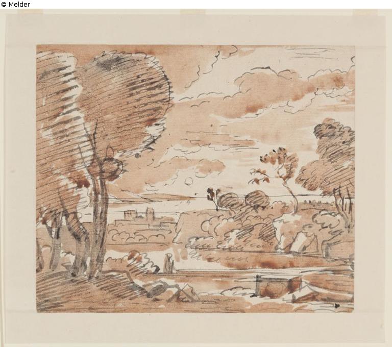 drawn (pen-and-ink drawing) black, brown ; washed red-brown
