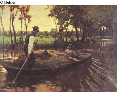 Spreewald, a family in a boat, man at the helm, returning from the field, evening mood