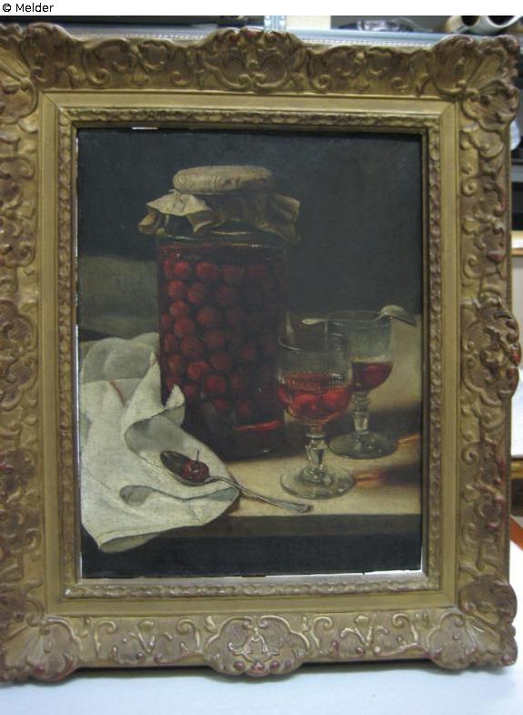 stretcher, upper right, old label: “French Gallery F. Bonvin No. 22639”, in black “KVdB 61283”; centre stretcher bar, label: “Kunsthandel Huinck & Scherjon N.V. Amsterdam – Heerengracht 469 No. 1574 1800.- F. Bonvin ‘Bocal de cerises’”; lower right, inscribed in pencil: “1554”; typewritten label: “François Bonvin (Vaugirard 1817–St-German-en-Laye 1887) Stilleben ‘Einmachglas mit Kirschen’ Signiert und datiert ‘F. Bonvin 1885’”