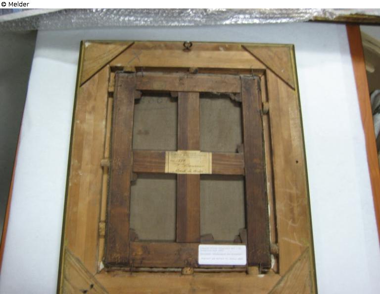 on verso, frame, upper left, inscribed in blue: “X”; upper right, inscribed in pencil: “U.A.A.A.”; lower right, illegible inscription; lower right, inscribed in white chalk: “1271”
