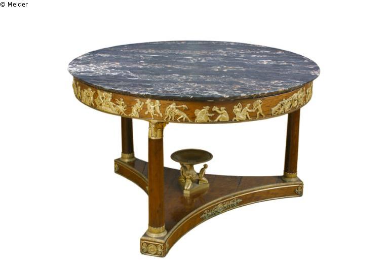 The round table on three pillars is characteristic of the French Empire. The high-quality gold-plated mountings on the frame show a procession of Bacchantes. The furniture is signed twice with G. Jacob. Jacob's family led an outstanding carpentry workshop unterr Louis XVI. and in the Napoleonic period. All important furniture for Napoleon refurbished castles came from there hand. The extensive work of George Jacob was inspired by English Chippendale forms. As jewelry for its linear, strict furniture he preferred rich bronze fittings in Greco - Roman - Egyptian style, but in addition also porcelain, so that the overall impression of his furniture is very ornate.