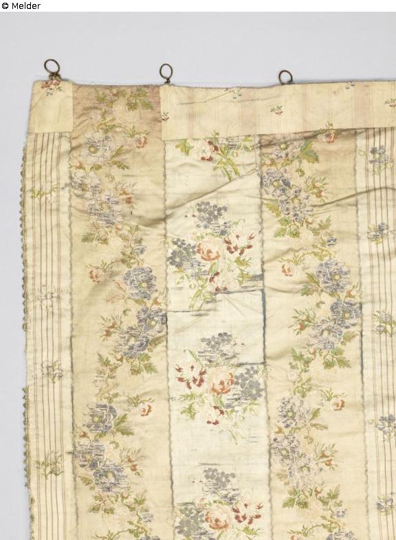 Torah curtain (Hebrew: Parochet) made of cream-coloured silk fabric with a floral pattern consisting of bouquets, wavy tendrils, stripes and scattered flowers. Later repairs with a different fabric.