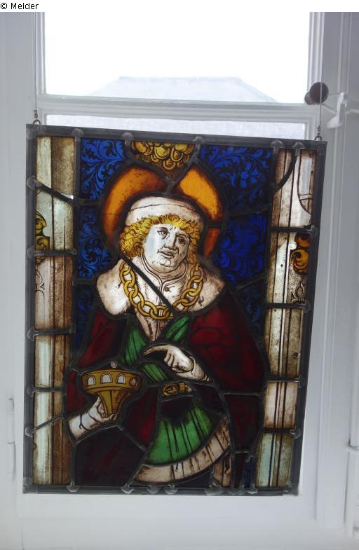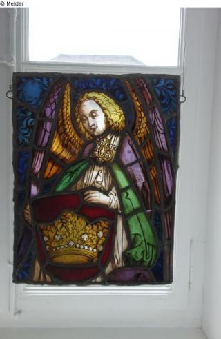 St. Guy; angel with a coat of arms with a crown; copies or forgeries after stained glass windows from the Kartaus Prüll in Regensburg (Bavarian National Museum Munich) and the window of the chandler guild in Ulm cathedral