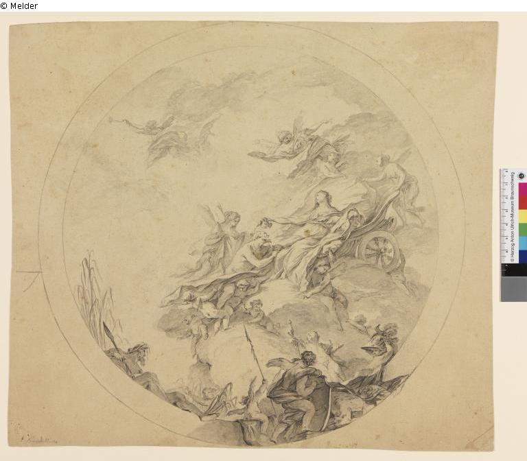 Design for a round ceiling painting. Hand drawing on paper. - Inscribed at lower left: "P. Bardellino" [new attribution of the Herzog Anton Ulriich-Museum: Pietro Bardellino 1728-1806]. Back side: In the middle with pencil and underlined "39", at lower right green crayon "696" ("646"?), left beside remains of pencil writing (erased): long series of numbers? (A [?] 166 [?] ... or 666[?]4[?]61 ..., below: t ... or A ...?)
