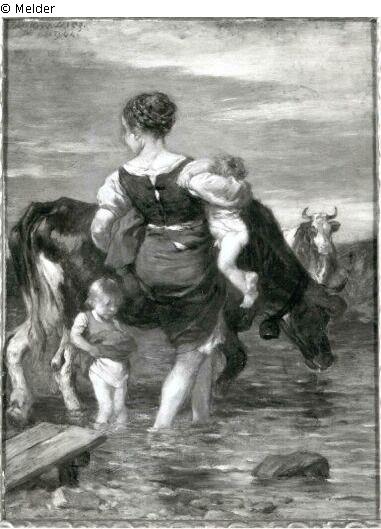 Found-Object Report | Object report Woman with two children and cows crossing a brook Lost Art-ID220959 Previous Next Artist / Creator Diez, Wilhelm von Birth 1839.01.17, Bayreuth Death 1907.02.25, München Place of activityBayreuth; München TitleWoman with two children and cows crossing a brook Dating1904Object typePaintingGroup of reported objectsPaintingMaterial / TechniqueOil ; Panel / painted Height 25.00 cm Width 18.50 cm Inventory numbermü9573Description Signatur: Wilh.v.Diez./1904; Frau in Rückenansicht,li.ein Kind d.Röckchen schürzend,das andere hält Frau i.re.Arm. Dahinter Kuh m.Glocke und, v.dieser fast verdeckt, weitere Kuh. Read more Read less Holding Kulturgüter aus dem ehemaligen ReichsvermögenProvenance Access in February 1943 Read more Read less Published since2001 Contact Kunstverwaltung des Bundes Herbert-Bayer-Straße 5 13086 Berlin Germany E-Mailprovenienzforschung@kvdb.bund.deHomepagehttp://www.kunstverwaltung.bund.de