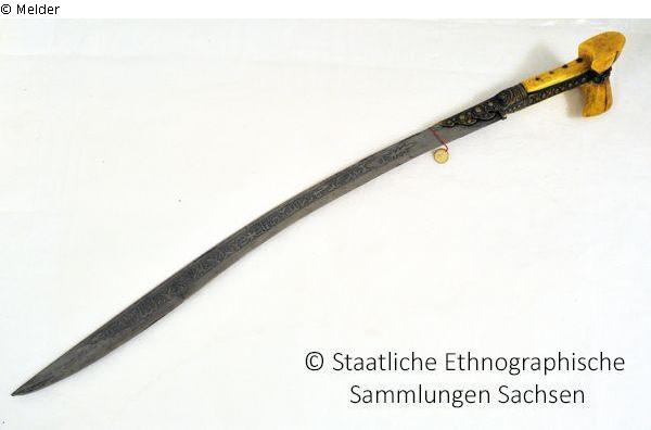 Turkish yataghan, blade with inscription "Work of Muhammad Sahib wa Malik" and ornamentation, blade mount and grip strap of brass ornamented, walrus tooth grip, dolphin's head, round pendant with no. 6