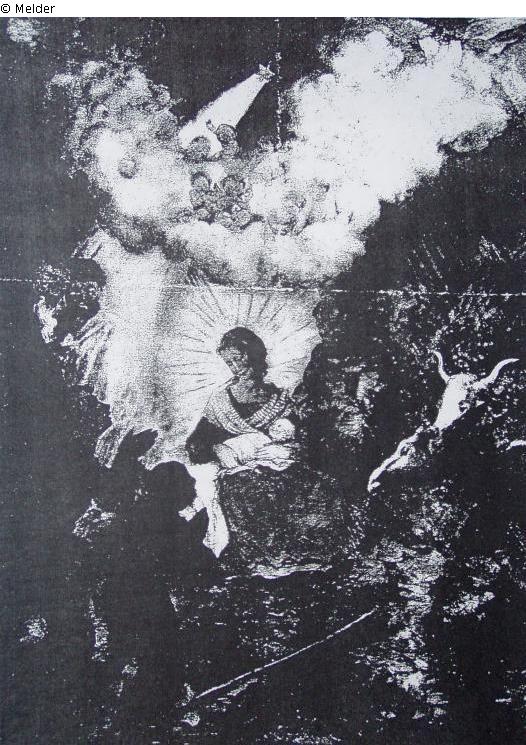 Angels singing and rejoicing on the clouds, in between the evening star; painted in a thin layer of paint with paraffin, in strong contrasts of light and dark; inscribed on the left: "Transparent für die Kinder eines Freundes in Frankfurt zu Weihnachten 1873 gemacht. KrH Okt. 1915 Hans Thoma"