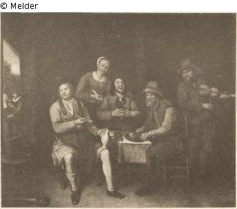 Three men at breakfast, served by a woman, on the right a violinist; signed and dated: 1654