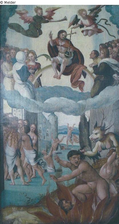 Right in front the damned guarded by a devil, left in the background the blessed. In the middle above, enthroned on a rainbow, Christ as judge of the world, saints on his side, angels flying above him.