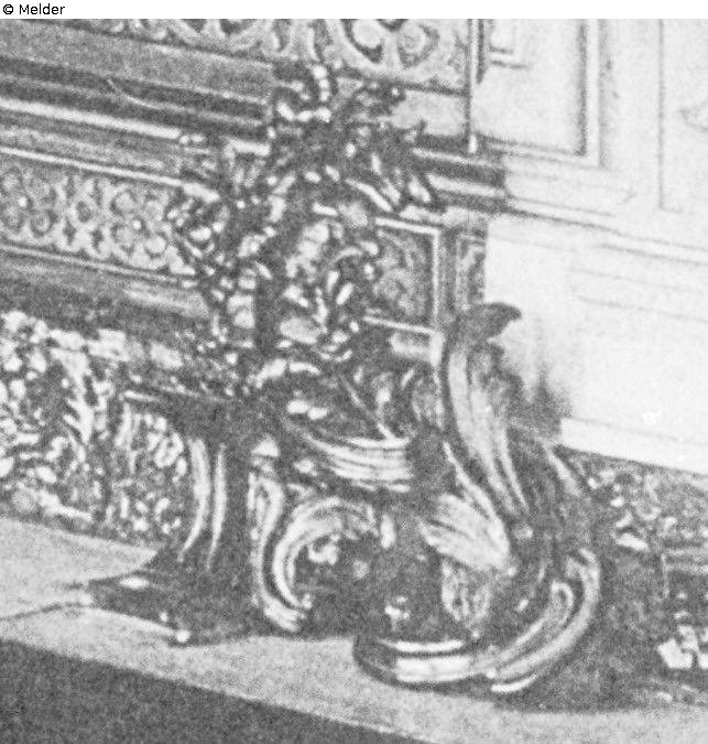 The andirons were probably placed permanently in front of the fireplace when the Small Ballroom was furnished in 1868; as part of the settlement agreement between the Free State of Saxony and the former royal house in 1924, the fireplace screen with the two putti figures became part of the inventory of the Free State of Saxony; the andirons were removed during the war. The exact location of the relocation site is unknown. Possible locations include Rammenau Castle, Schönfeld Castle, Zottewitz Castle, Rothschönberg Castle and Schleinitz Castle; the further whereabouts of the andirons are unknown; it is assumed that they were lost in connection with the events of the Second World War.
