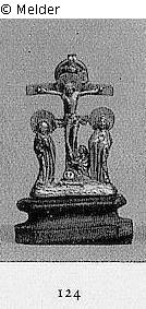 mit Christus am Kreuz, flankiert von Maria und Johannes, zu Füßen die kniende Magdalena; dabei: zwei Miniaturfiguren aus vergoldeter Bronze und Silber: a) Heiliger mit gefalteten Händen, b) Christophorus mit dem Jesusknaben, 15. und 16. Jahrhundert