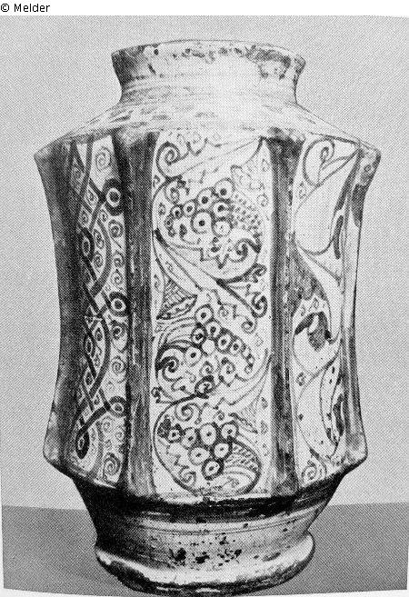 leicht eingeschweifte Wandung besetzt mit sechs Rippen. Blaue Bemalung mit stilisiertem Pflanzendekor nach spanisch-maurischen Vorlagen. Glasur Absprünge.