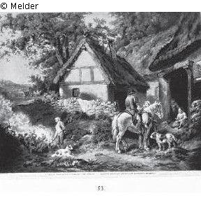 Bauerngehöft, rechts wird einem Reiter ein Trunk gereicht, links legt ein Junge Feuer an. Nach G. Morland. London, Colnaghi, Sala & Co. Gr.-Qu.-Folio.