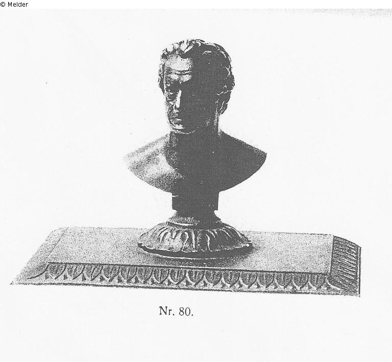 nach [Christian Daniel] Rauch; Beschreibung Graupe: " Büste, in Nachbildung von Christian Daniel Rauch (1820), mit Inschrift 'Goethe', in Eisen, aus der Königlichen Eisengiesserei in Berlin. Büste 75 mm (mit Sockel) hoch. Das Ganze auf einer flachen verzierten Eisenplatte. Größe der Eisenplatte 75 : 104 mm. [Literatur:] [Ernst] Schulte-Strathaus[: Die Bildnisse Goethes. München 1910. Abb.] 118. [Hermann??] Rollett: [Die Goethe-Bildnisse: biographisch-kunstgeschichtlich dargestellt. Wien 1883. Abb.??] LXIX. Sehr seltenes Stück. Prachtvolle Erhaltung."; Inventarverzeichnis Sammlung Rosenbacher; Paul Graupe, Auktion vom 16.06.1917, Bibliothek Otte - Wiesbaden, Auktion V, Nummer 80; Ernst Schulte-Strathaus: Die Bildnisse Goethes. München 1910. Abb. 118; Schätzwert 187,- M