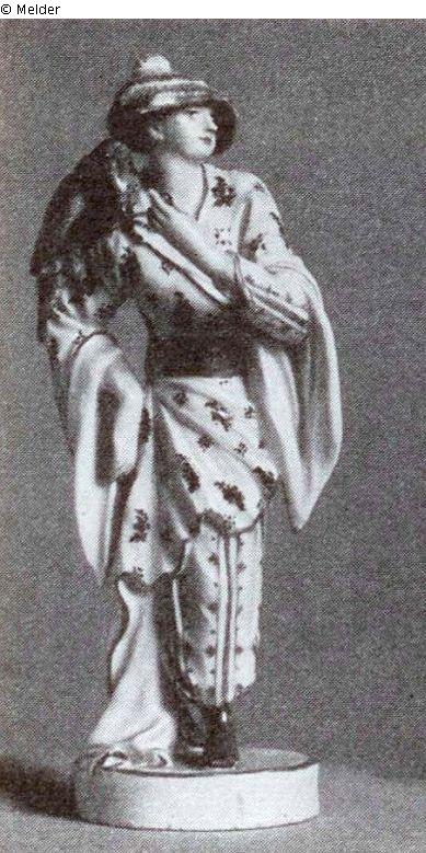 Untergewand und Hosen weiß mit kobaltblauem Muster, Mantel strohgelb mit purpurviolettem Muster, Schuhe zinnoberrot, Federhut blau gerändert, innen lachsrot, Papagei in bunten Farben. Marke: Doppel-C unter der Krone; Quelle: Staatliche Museen zu Berlin (Hrsg.): Drei Jahre Nationalsozialistischer Museumsarbeit: Erwerbungen 1933-1935. Berlin 1936. Katalognummer 154.