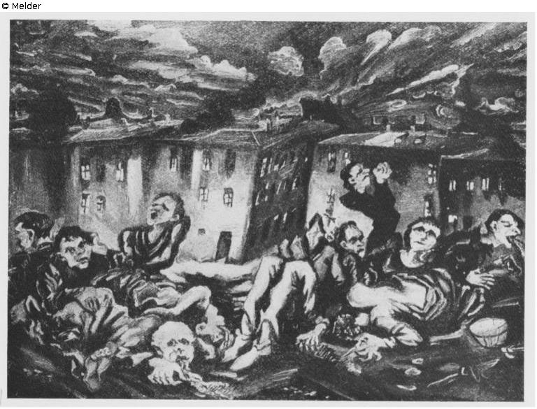 Lothar Brieger: Ludwig Meidner. Mit Einer Selbstbiographie des Künstlers (= Junge Kunst, Band 4), Leipzig 1919 S. 20 'Cholera, 1912 Besitzer: Felix Simon, Zehlendorf' ; Ludwig Meidner. Eine autobiographische Plauderei (Junge Kunst, 4) 2. Auflage, Leipzig 1923.; Thomas Grochowiak: Ludwig Meidner. Recklinghausen 1966. S. 69 'Bisher nicht aufgetaucht ist ein 1912 gemaltes Bild Cholera...' Kat.-Nr. 36 'Cholera, 1912, Öl auf Leinwand, Besitzer unbekannt'; Neue Kunst Hans Goltz <Firma> [Hrsg.], Neue Kunst: Katalog der II. Gesamtausstellung, Neue Kunst Hans Goltz, München; August - September 1913 — München, 1913, S. 131 Meidner, Ludwig Nr. 105 Cholera [dieses Werk?]; Katalog der ersten Ausstellung der Freien Secession Berlin 1914, S. 34: Ludwig Meidner, Nr. 156: Cholera, mit Abbildung (ohne Besitzerangabe, unverkäuflich) ; Paul Cassirer: Ludwig Meidner. Gemälde Aquarelle Zeichnungen. Zweite Ausstellung. Berlin Februar 1918, Nr. 31 Cholera. 1912/13. [eingesehen, dieses Werk?]; Kestner-Gesellschaft, Juli bis 27. August 1918, Ludwig Meidner / César Klein, (=XVIII. Sonderausstellung), ohne Seiten, Nr. 47. 'Cholera, 1912/13....unverkäuflich' m. Abb. ; Ausst.-Kat. Potsdamer Kunstverein: Kunstausstellung Potsdamer Kunstsommer 1921. in den Räumen der Orangerie des Parkes von Sanssouci; [Veranstalter: Potsdamer Kunstverein mit Unterstützung der Stadt Potsdam]. Mitte Juni bis Mitte September 1921, S. 18, Kat.-Nr. 83."Cholera" ; Das Problem der Generation, Die um 1880 geborenen Meister von heute, I. Teil: Die Deutschen, Galerie Alfred Flechtheim, Berlin W 10, Lützowufer 13, 22. Juni bis Anfang August 1927, Nr. 78 ; Eliel, Carol S. (Hrsg.): Ludwig Meidner. Apokalyptische Landschaften. [erschien zu der gleichnamigen Ausstellung in der Berlinischen Galerie, Martin-Gropius-Bau, Berlin, vom 3. Februar bis 8. April 1990]. München 1990, S. 16, Abb. 8 2Cholera, 1912, Öl auf Leinwand. Verschollen". ; Breuer, Gerda und Ines Wagemann: Ludwig Meidner. Zeichner, Maler, Literat. Ausstellung Mathildenhöhe Darmstadt 15. September 1991 - 1. Dezember 1991. Stuttgart 1991. 2 Bände, Band 2, S. 149 mit schwarz/weiß Abbildung. ("Cholera, 1912, Öl auf Leinwand, Besitzer unbekannt).