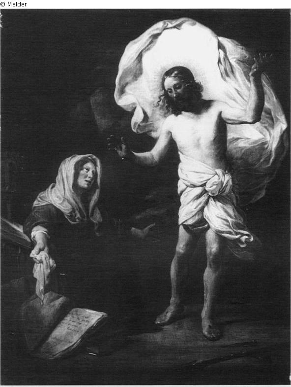 On the left, Mary kneels at an altar and turns with a surprised gesture towards the figure of Christ appearing to her right. This figure, only partially enveloped in a white cloth, the fluttering ends of which serve as a background to his body, has stretched out his right hand in blessing and is pointing upwards with his left. In the foreground next to the altar, on which a cross with a crown of thorns hanging over it has been placed, lie several books and an open tome with a quotation from the first chapter of Lucä and the 20th of John in Dutch. On the right in the foreground at the feet of Christ the instruments of torture. Inscribed on the left side of the leaf