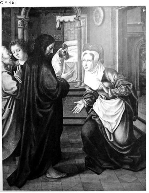 Scene in the house of Martha und Maria, 4 persons in the foreground, in the background arc with colomns, person kneeling in front of a bed.