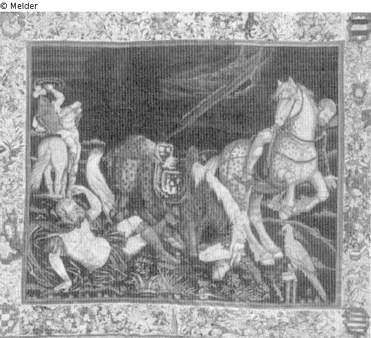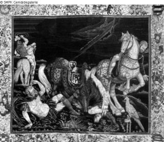 Gobelin, Textilkunst: Wandteppich: auf dem Weg nach Damaskus erscheint Christus dem Saulus, der durch das Licht erblindet und vom Pferd stürzt; Christus; fallen; Pferd; Blindheit; Licht; Reise; nach einer nicht näher zu bestimmenden Arbeit des Hans Baldung-Grien (1484/85 - 1545) / Bez. diagonal oben Mitte: .SAVLE(..LE) QVID.ME. PERSEQVRis.; Signatur: siehe 'Beschreibung'; Maße: 300 x 350 cm