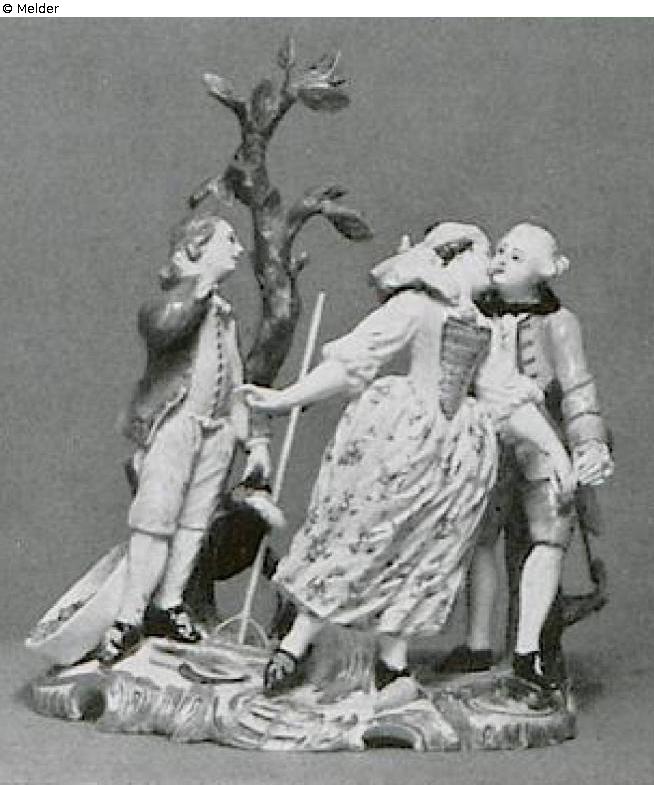 „Le baiser donne.“ The landlord kisses the young wife of his farmer standing beside him and scratching his ear. The manor in a gold-lined, light-purple suit. The woman in yellow bodice with iron-red plug and colorful-flowered, white skirt. The farmer in a light blue jacket, light brown vest, and light yellow knee-length pants. Next to the tenant a leafy tree trunk and a basket of hay. The pedestal is decorated with purple and gold-rimmed, raised rocaille. Particularly beautiful shaping. Eisenrotes Rad, and C. The group corresponds to Filloul's own epigraph according to a painting by Paters, to which Moraine wrote verses that are based on a narrative of Lafontaines. The engraving, however, is not the model of this Hoechst Group. The Frankenthaler group "The Given Kiss" goes back to the Hoechst Group