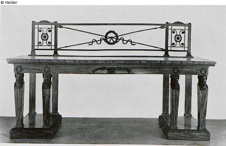 With black-green decorations of metal and carved wood. Three parts. The serving table hold by four bearded hermas, the plate at the backside with antiqued grid with two crossed Thyrsus staffs and garland of grapes, it is flanked by two detached altar-alike cabinets on lion feet, with garlands of grapes and palmettes, on them two candelabras in shape of antique tripods. The wooden, carved candelabras with arms of metal, coated in black-green, with porphyry-coloured plinth. German, around 1825. Present of King Ernst August of Hannover to his brother-in-law, the Grand duke of Mecklenburg-Strelitz. (Comp. H. Schmitz: „Deutsche Möbel des Klassizismus“, Stuttgart 1923, S. XXXV and depiction p. 180). H. of table 100 cm, with grid 155 cm, W. 265 cm, T. 90 cm. H. of cabinets 108 cm. candelabra H. 120 cm. Literature: Auktionskatalog Hans W. Lange, Wertvolles Kunstgewerbe, Berlin, 19.-21. Mai 1941, S. 31. Nr. 114, Taf. 24 (DOI: external link)