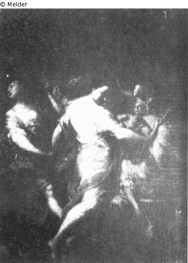 Large figures of the women dancing. In the foreground centre with her back turned to the viewer is a brightly-lit figure of a woman.