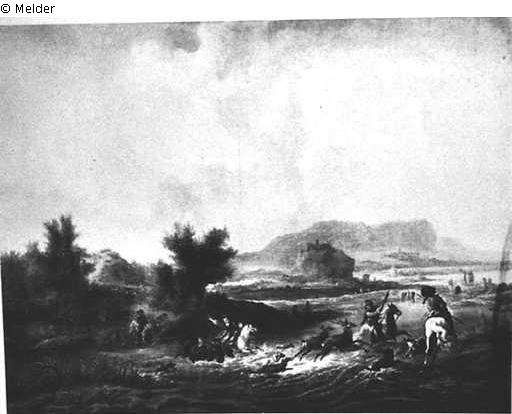 The stag and hind, pursued by dogs, rush into a river, on the right bank of which two hunters armed with spears are waiting for them. The animals are followed by a lady on horseback and a gentleman who is about to fall into the water. On the left another hunter on horseback and a servant. Mountainous landscape with a rock castle and country houses. Lower margin about 3 cm. Gold frame. Formerly Petersburg, Hermitage. Cat. 1901, No 1036 (from the collection of Count Brühl). Inscribed with monogram at lower left. Engraved: Moyreau, 1747. no. 56 as "L'accident du chasseur", and by Tischler.