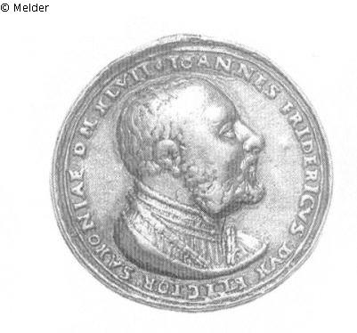 Medaille. Vs.: Kurzes Brustbild nach rechts, bärtig und barhaupt. Umschrift: IOANNES FRIDERICVS DVX ELECTOR SAXONIAE DMXLVII [Rhombus]. Rs.: Wappenträger mit den beiden sächsischen Wappenschilden und der Helmzier auf dem Kopf. Umschrift: PRO VEROE RELIGIONI ET LIBERTA GERMA.