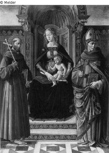Panel painting: depiction: Mary seated or enthroned, the Christ Child seated on her knee & the founder of the Franciscan Order, Francis(isc) of Assisi, possible attributes: book, crucifix, lily, skull, stigmata: archbishop, bishop etc. (Roman Catholic); Madonna; Christ child; knee; sitting; left & Francis of Assisi (saint); skull; stigma; lily; book; crucifix: archbishop; bishop.
