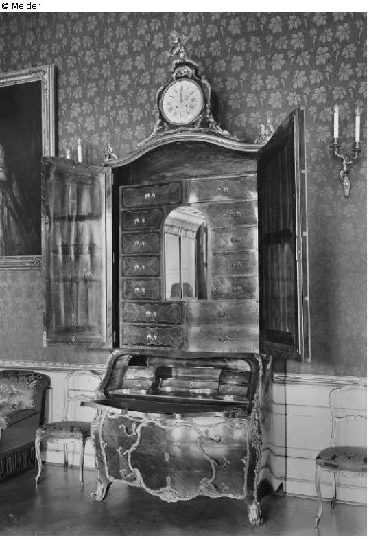 The writing cabinet came from the palace of Count von Brühl to the Dresden Castle in 1825. In the inventory no. 1 of 31.01.1920 from 1920 it is listed in the "Fremdenquar. No. 2 am Bärengarten. Vorzimmer". According to the settlement agreement of 1924, ownership of the writing cabinet was transferred to the Free State of Saxony. The 1942 inventory list mentions 4 mirror cabinets. In August 1943, the most valuable furniture and clocks were transported to a relocation site (Rammenau or Schieritz). A loss in connection with the events of the Second World War is assumed.