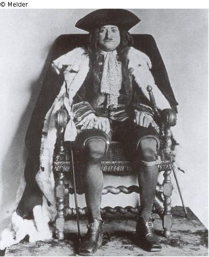Kopf und Hände aus Wachs modelliert von Johann von Kolm; Uniform original, darüber die Bänder des englischen Hosenbandordens (blau) und des schwarzen Adlerordens (orange) mit Kreuz; unter dem linken Knie des Königs die zum Hosenbandorden gehörige Schnalle mit der Devise des Ordens: "Hony soit qui mal y pence (sic!)"; noch zu Lebzeiten des Königs zusammengesetzt