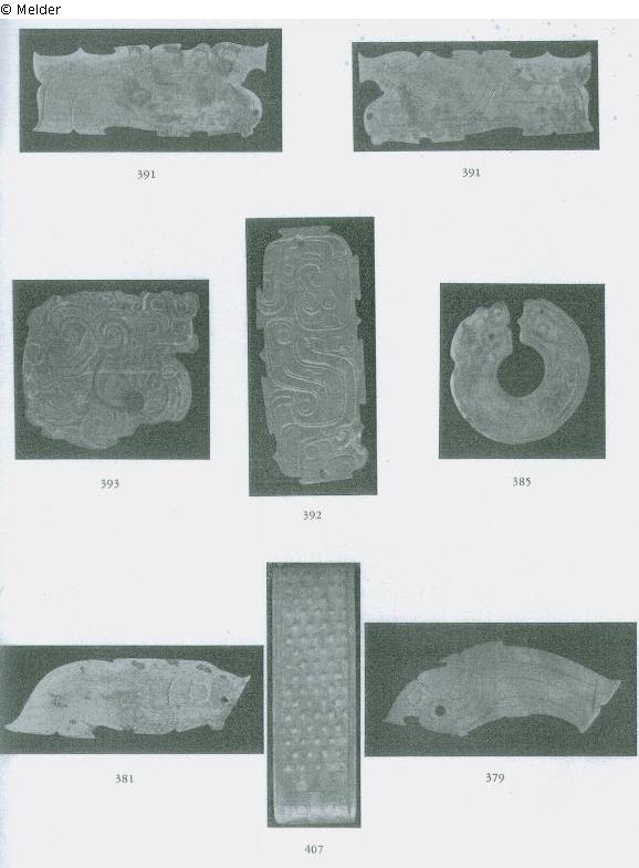In Form von verschlungenen Drachen in Reliefschnitt. Han oder früher. Mit Mennigrot.