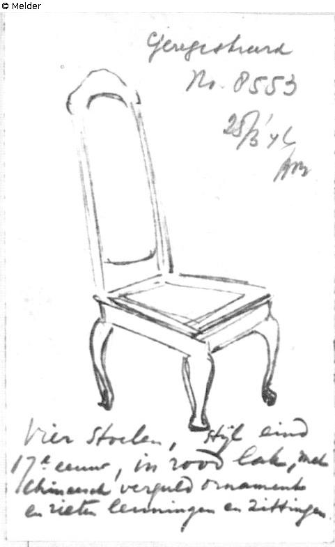 source: Algemeen Politieblad van het Koninkrijk der Nederlanden, Jg. 95, Nr. 34, 30. November 1946 publizierten Liste 719 „Te ‘s-Gravenhage ontvreemd in 1943/1944, hollandsche teekeningen, t. w.“; Intern Aangifte Formulier vom 25.3.1946, BArch Koblenz B 323/2 fol. 149 mit eigenhändiger Skizze von F. Lugt