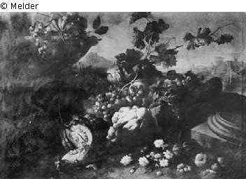 Between a fountain and a column base, there are a pumpkin, grapes, a cauliflower, a pomegranate, apricots, plums, etc.; a seaside town in the background.