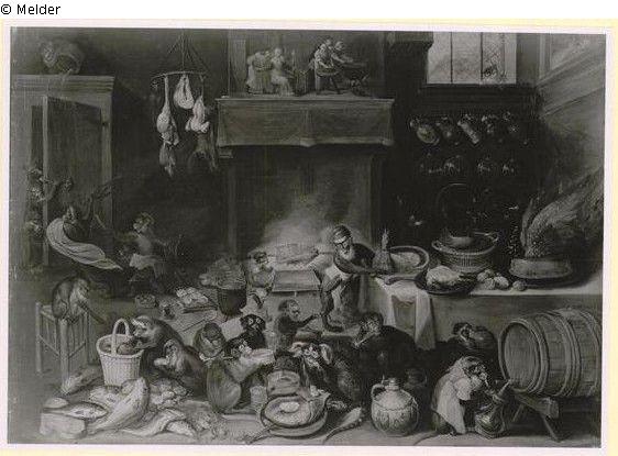 Lustige Affengesellschaft in einer mit Vorräten aller Art angefüllten Bauernstube. Öl auf Holz, parkettiert, 47x67cm, unsign. Rückseite Siegel der Slg. Wassermann