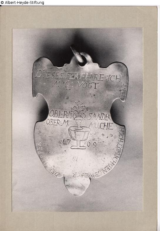 Baroque plaque with eyelet, depicting a vase on a potter's wheel, with the year ‘1769’. Inscription around the edge: ‘DIESES FEREHRE ICH / AN EIN HOCHLÖBLICHGEN GEWERCK DER DEPPER’ (I honour this / to a highly commendable craft of the Deppers), followed by the names of the donors: ‘M. G. VOGT / OBERM. SANDER / OBERM. MUCHE’. According to Mirow, there are further names on the reverse: M. Francke S., M. Schubert, M. Rohsenbund, M. Fultz S., M. Hanel, M. Lantz, M. Wiederner, M. Laumert, M. Kuptohe (?), M. Francke, M. Zohbel, M. Kaltschmied, M. Lesche, M. Fieltz J.