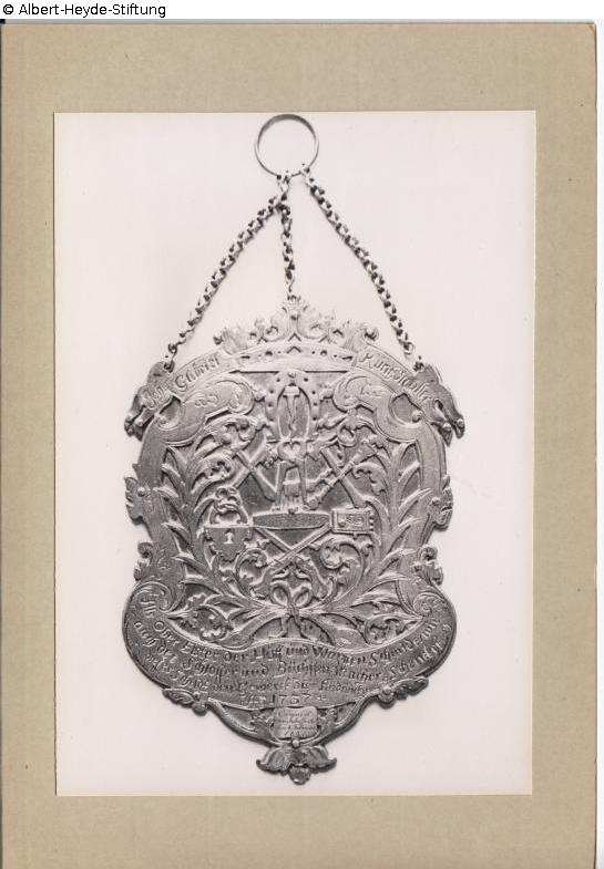 Baroque cartouche on three chains: Ensemble of tools and products used by locksmiths, crowned by a palm wreath. Caption below: Als Ober Elster der Huff und Wapffen Schmide, wie auch der Schlösser und Büchssen Macher schencket dieses Schildt den Gewerck zum Andencken Anno 1737“. Donor's name on both sides of the crown: ‘Joh. Gabriel Kunstschlosser’. Later added at the bottom: ‘Erneuert zum Jubelfeste den 4. Februar 1837’.