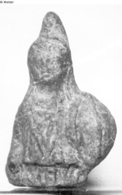 Phrygische Mütze, ovaler Schild mit Mittelrippe, drei Löcher oberhalb des unteren Randes, ein Loch auf dem Kopf